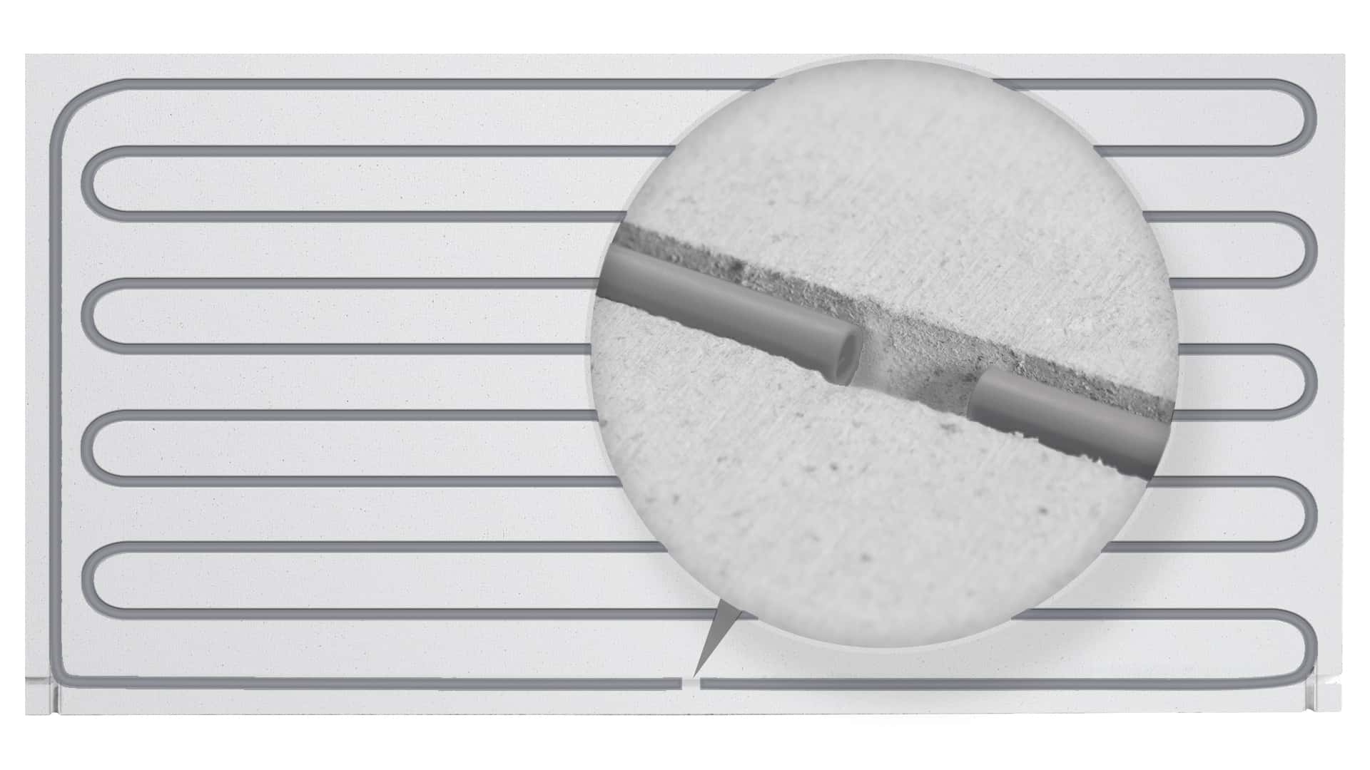 SYSTEM KAN‑therm Wall heating and cooling panels in the drywall system are gypsum and fibre panels with milled grooves and PB polybutylene or PE-RT polyethylene pipes with a diameter of 8×1mm placed inside. The heating and cooling panels of SYSTEM KAN‑therm Wall are available in several different sizes with different spacing of pipes and varied filling of the panel by the pipe. Thanks to such a configuration it is very easy to make heating and cooling overlay even on the most geometrically difficult wall surface. Inactive wall surfaces can be covered with supplementary gypsum and fibre panels available in the offer of System KAN‑therm Wall.
