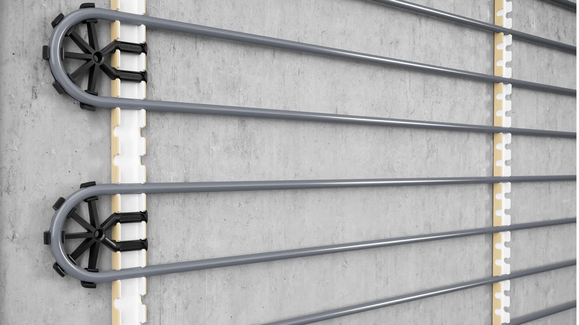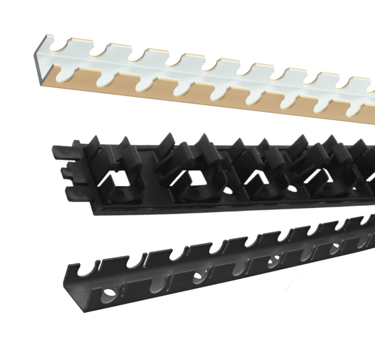 Modular strips, come in sections of 0.2 m to 1m. They enable installation of pipes with specific diameters of 12-17mm, 16-17mm and 12-22mm, with spacing of 10cm.