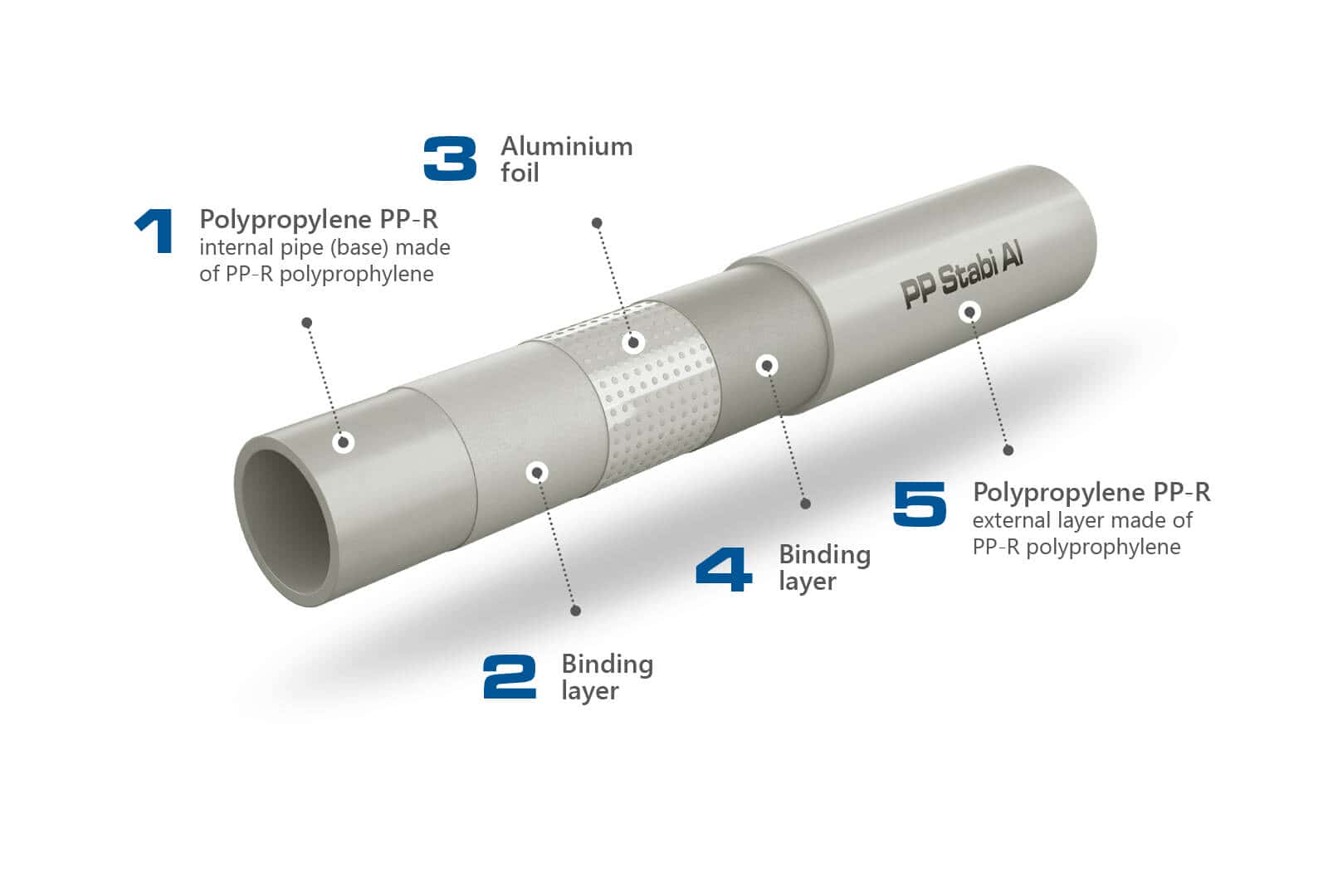 PP Stabi pipes, where a layer of aluminium tape is used to strengthen the pipe as part of its structure. Pipes of this type, due to the their low coefficient of thermal expansion, are most often used for installations with a high temperature of the transported medium, e.g. central