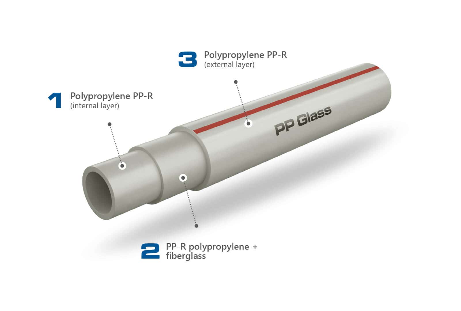 PP Glass pipes are the pipes whose structure combines the properties of Stabi pipes with the comfort of assembly of uniform pipes. Thanks to the application of a layer of glass fibre, the pipes do not require any additional mechanic treatment (removal of Al foil) prior to sealing, plus they feature a low thermal elongation coefficient. Pipes of this type are most often used for installations with a high temperature of the transported medium, e.g. central heating. Available in the range PN 16/S3,2 (SDR7,4) and PN 20/S2,5 (SDR6).