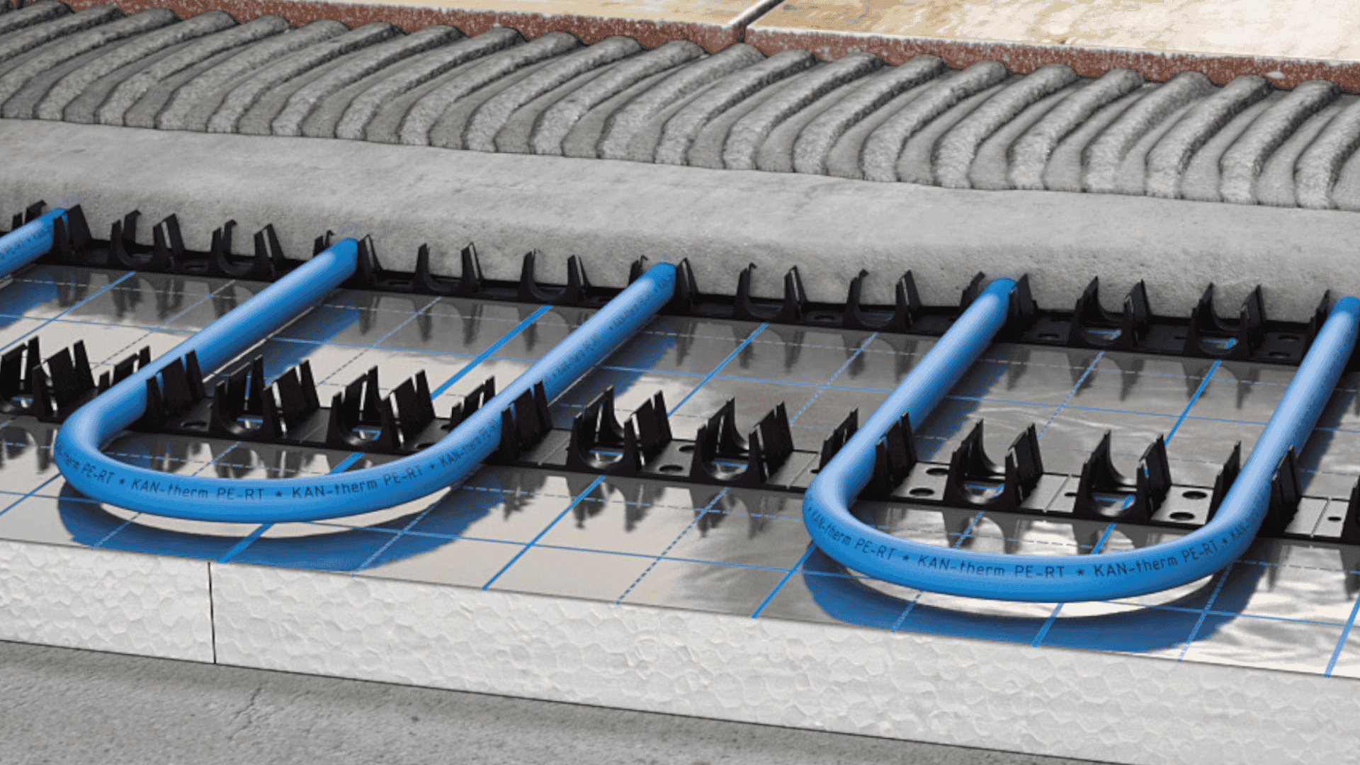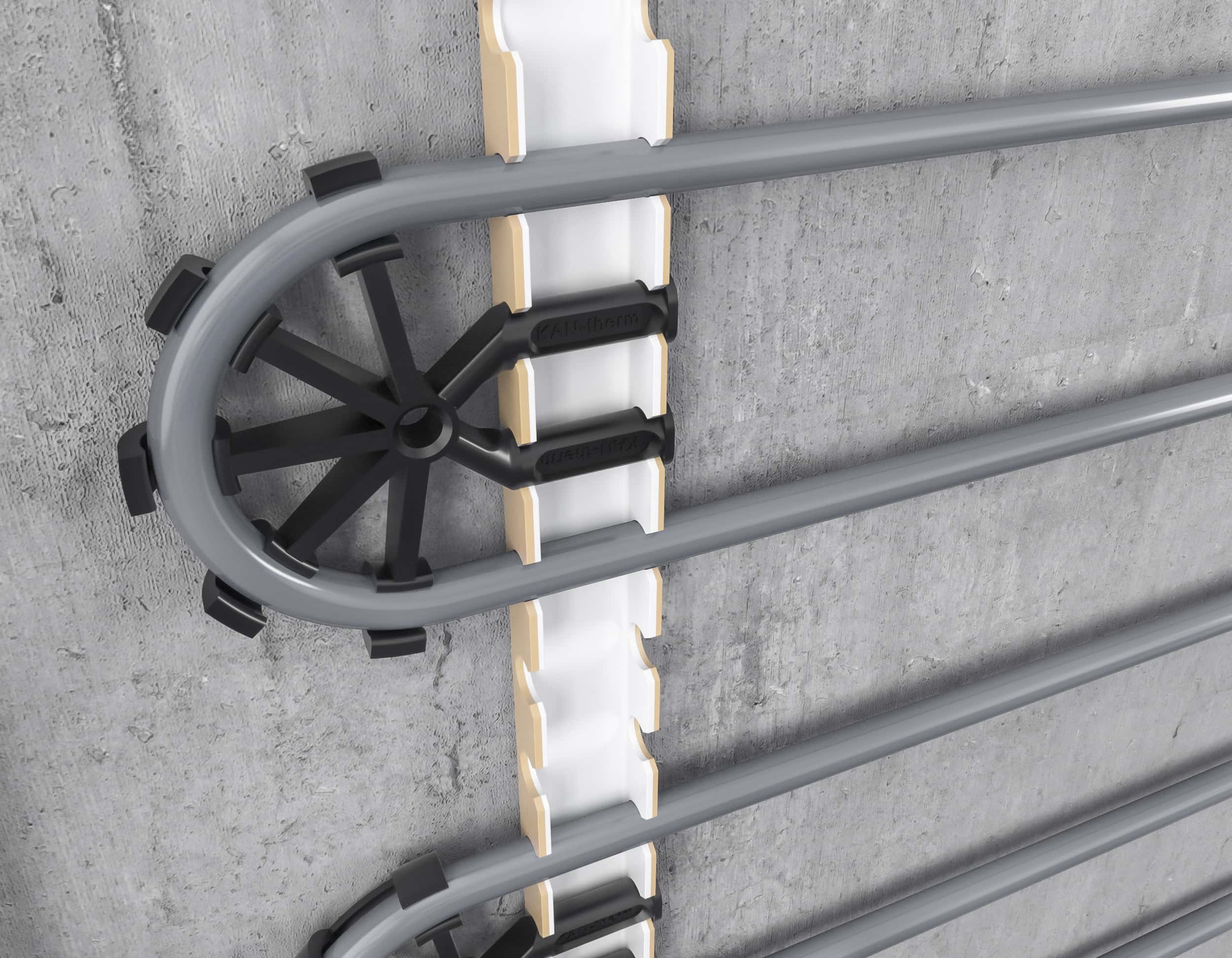 SYSTEM KAN-therm Rail is a complete installation system, designed for the construction of underfloor and wall heating and cooling installations, as well as heating and cooling installations of outdoor spaces. The main pipe anchoring element in System KAN-therm Rail are special plastic strips.