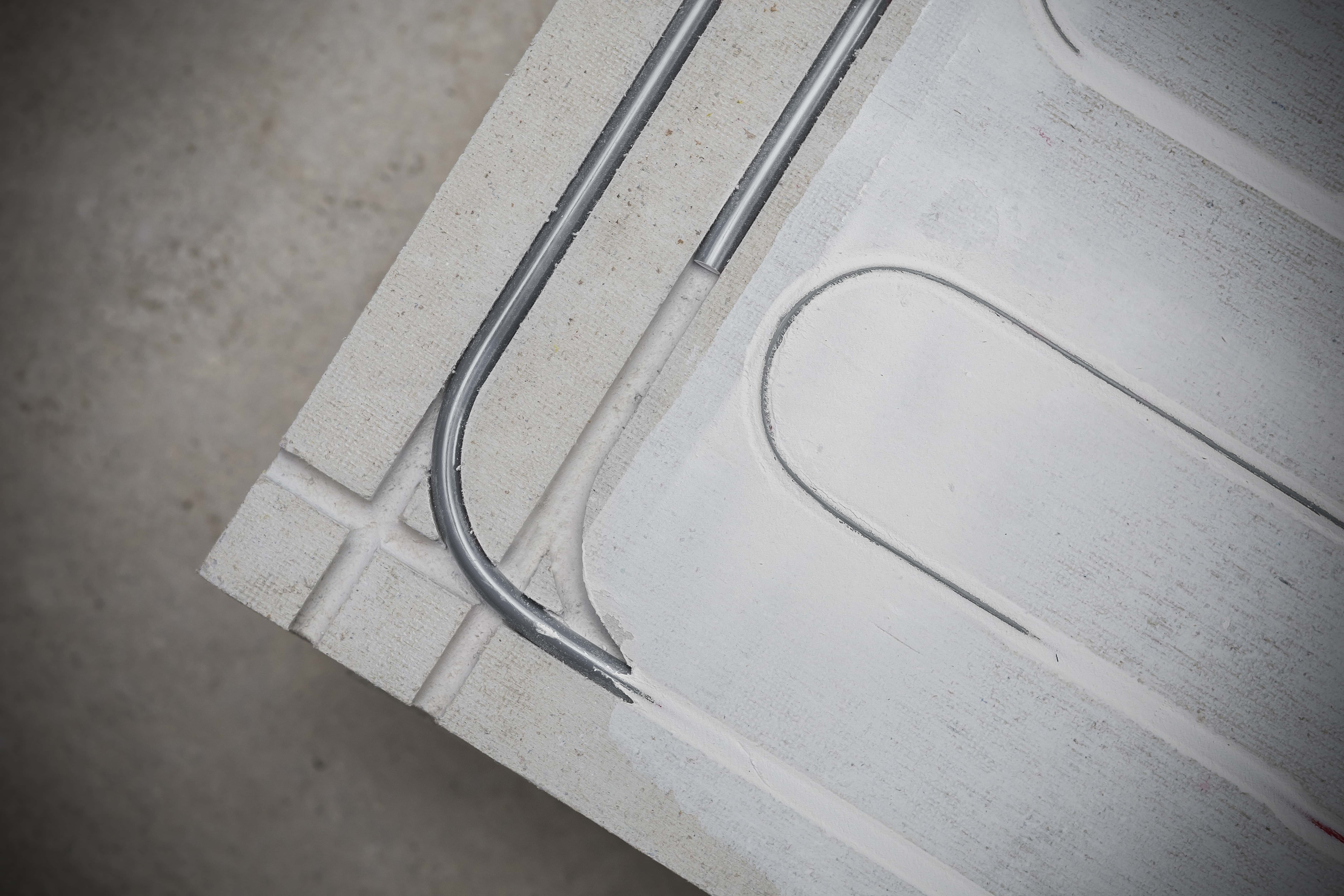 Heating and cooling panels of system KAN‑therm WALL in the drywall system are gypsum and fibre panels with milled grooves and PB polybutylene or PE-RT polyethylene pipes with a diameter of 8×1mm placed inside, which are part of the System KAN‑therm offer. By sticking directly to the partition or using a special frame, they can be mounted on walls and ceilings.