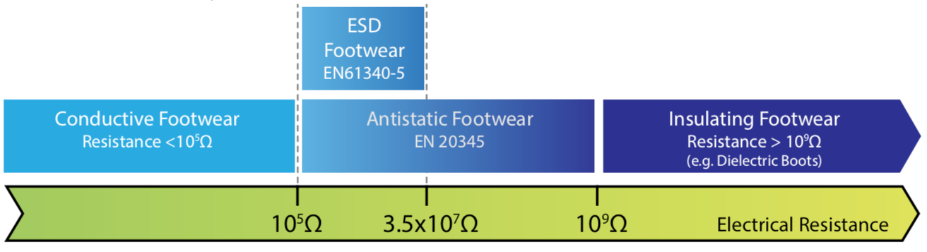According to EN 20345: 2011, a shoe or boot is considered to be antistatic if its’ measured electrical contact resistance falls between 100 kΩ (105 ohms) and 1 GΩ (109 ohms). With a lower resistance, a shoe or boot is considered to be conductive and at higher values, to be insulating. This 100kΩ to 1GΩ range is regarded a sensible compromise, giving protection from electrostatic build up and protection from electrical shocks at lower voltages.